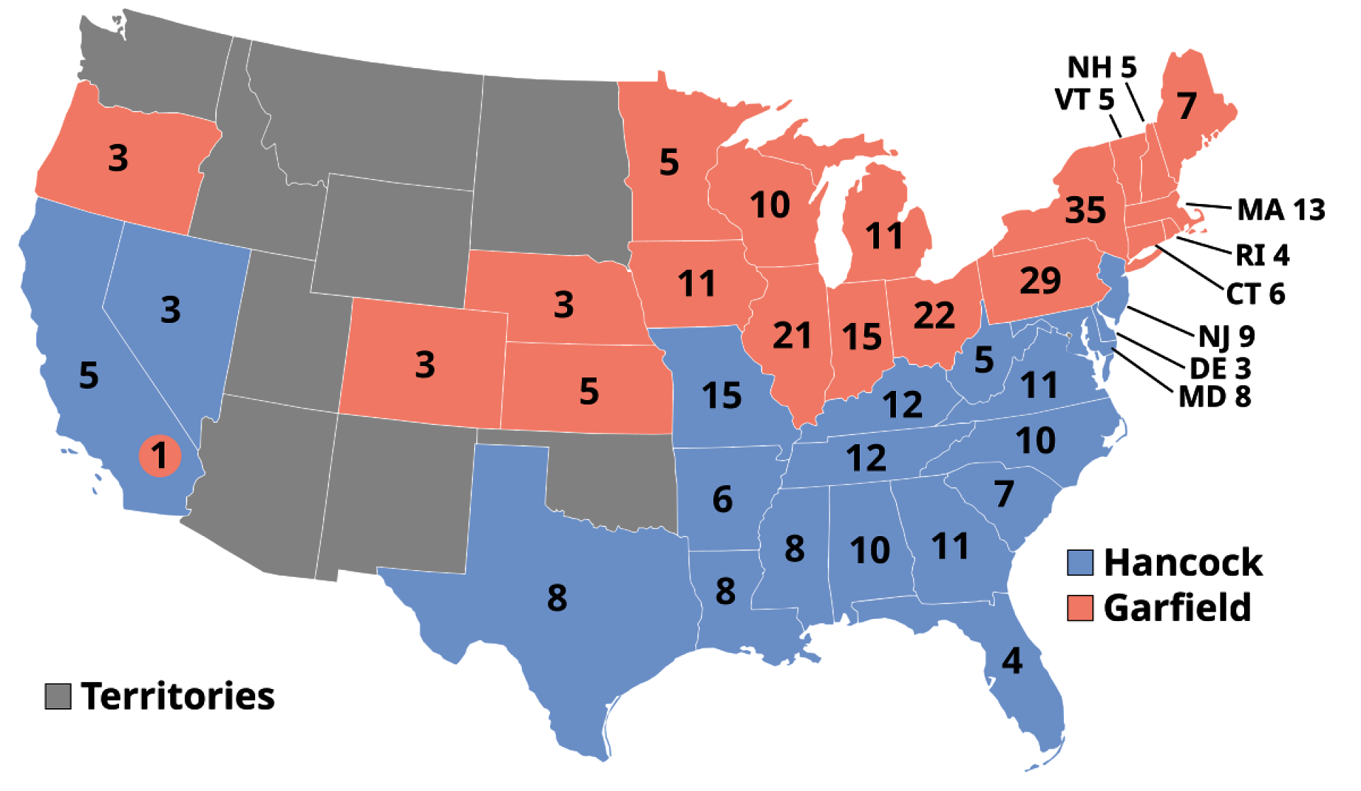 V roce 1880 byl prezidentem USA zvolen republikán James Garfield. Hlas mu dalo 4 446 158 voličů. Kolik hlasů získal poražený Winfield Hancock?