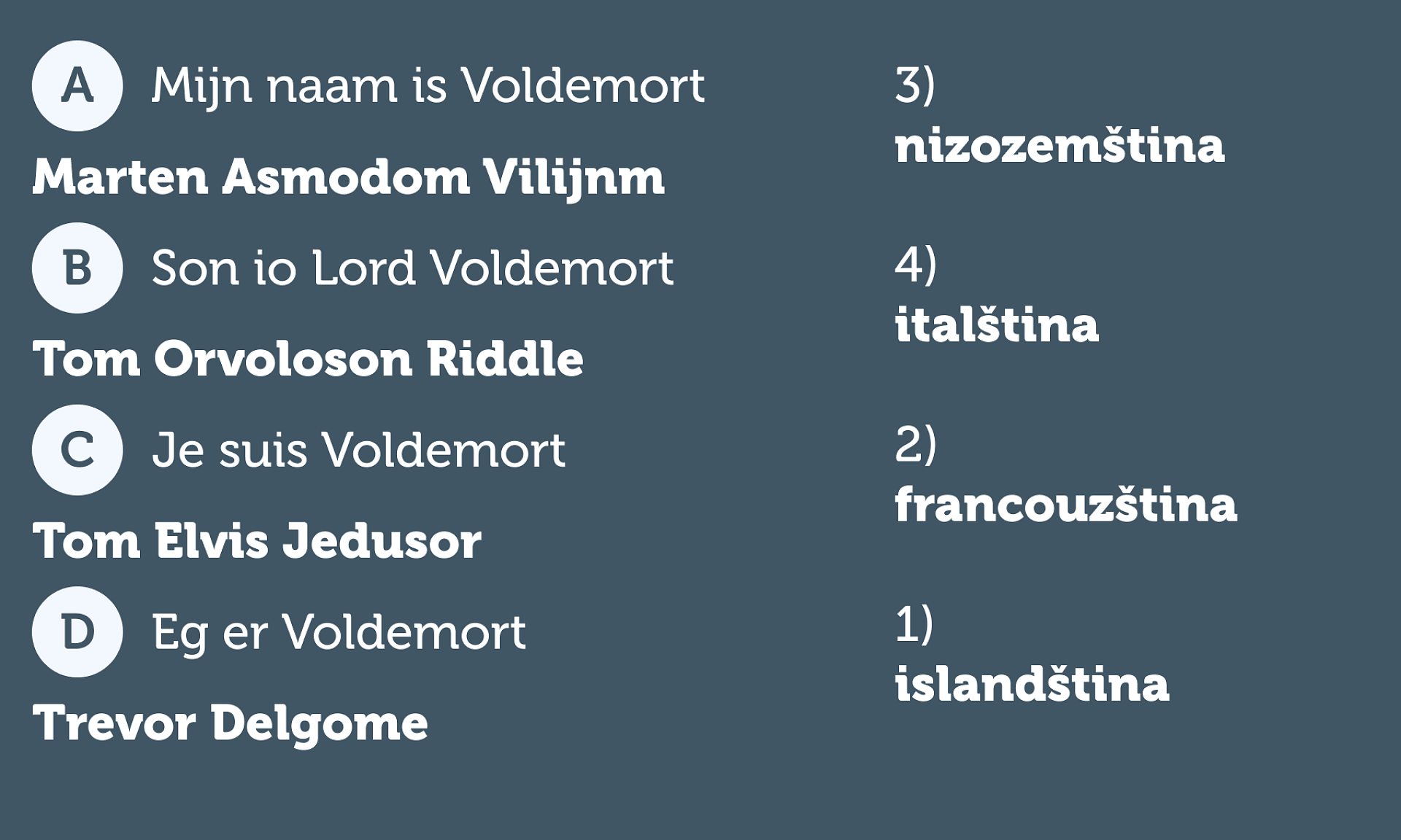 Aby byl v různých jazycích zachován smysl přesmyčky, z níž vzniklo jméno Voldemort, bylo zapotřebí změnit při překladu i jeho „civilní“ jméno. V originále je to Tom Marvolo Riddle, což se do češtiny „přeměnilo“ na Tom Rojvol Raddle. Na vás je teď spojit uvedené jazyky se jmény, pod kterými je v nich Voldemort znám.