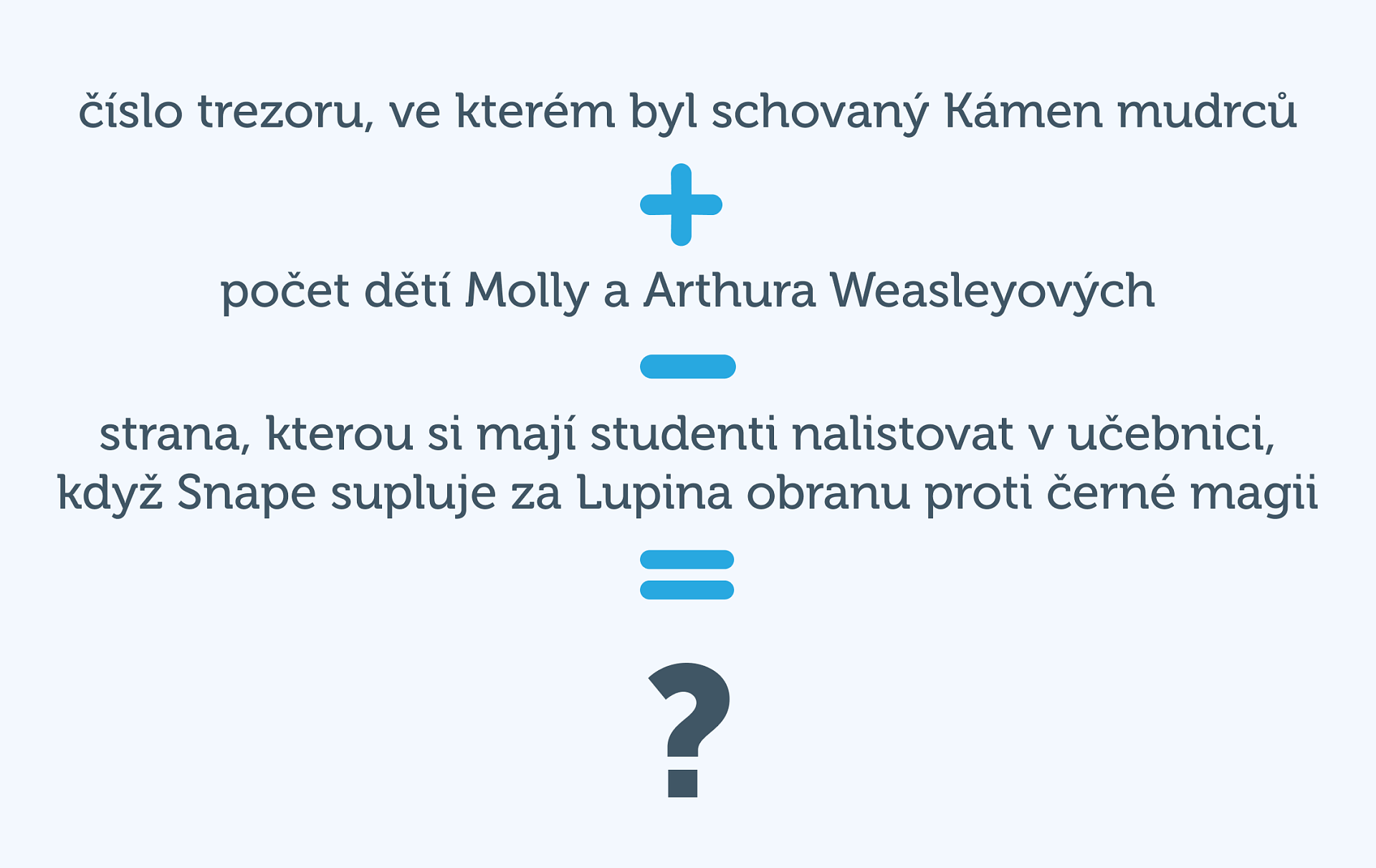 Jaký je výsledek této matematické operace? Číslo trezoru, ve kterém byl u Gringottových uložen Kámen mudrců + počet dětí Arthura a Molly Weasleyových − strana, kterou si mají v učebnici nalistovat studenti, když Snape supluje za Lupina obranu proti černé magii.