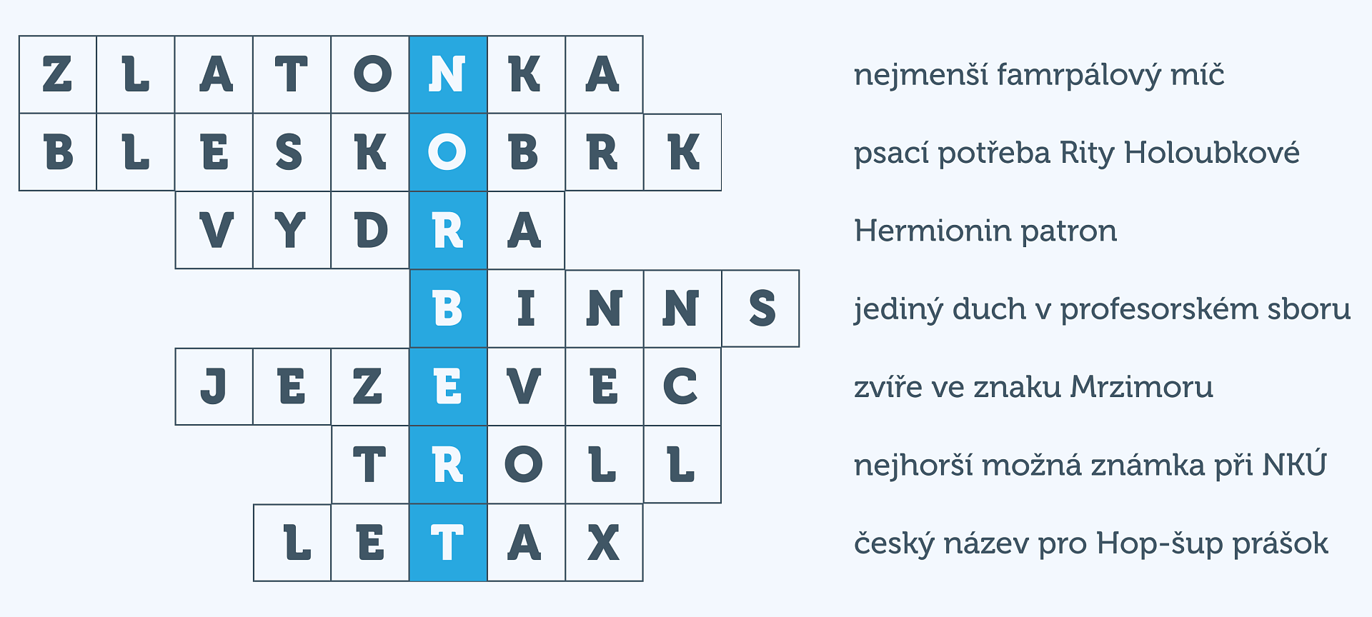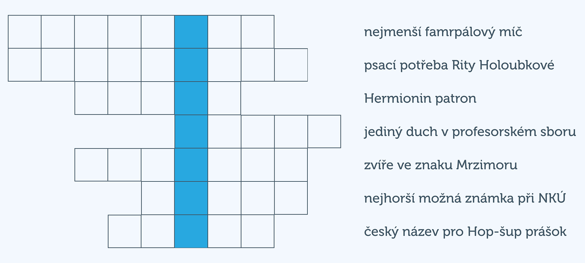 Pátý bod tématu obdržíte za vyluštění této křížovky. Hledaná sedmipísmenná tajenka je označená modrou barvu.