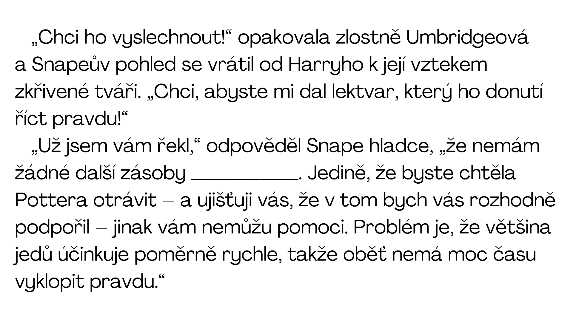 V tomto úryvku z knihy jsme vynechali jednoslovný název velmi mocného lektvaru. Pokud ho doplníte, bod je váš!