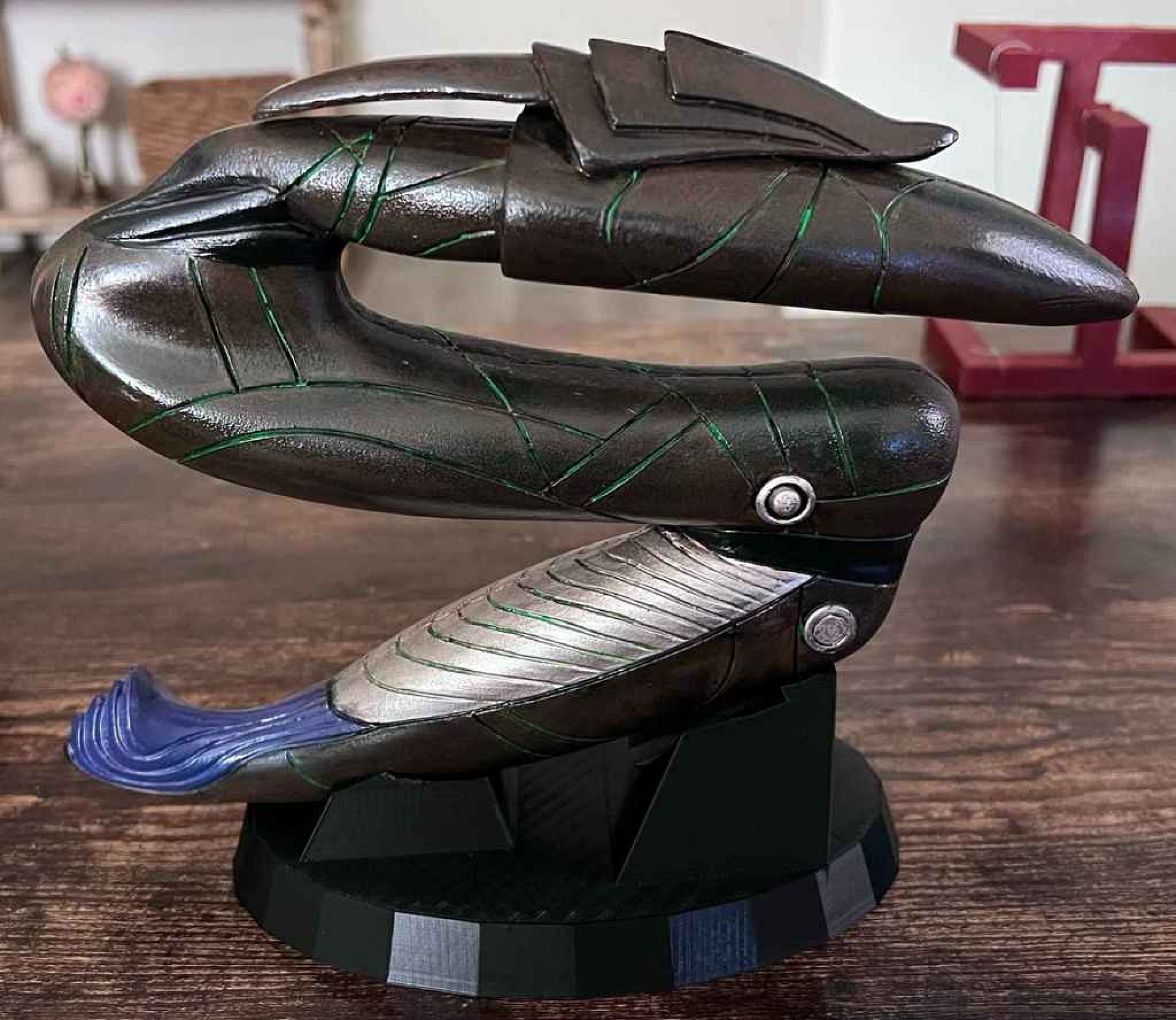 Na obrázku vidíte zbraň, která při prvním zásahu omráčí, druhým zabíjí a třetím rozloží. Napište (můžete foneticky), jak se zbraň a mediální sci-fi franšíza, ze které pochází, nazývá. Každý údaj za polovinu bodu.