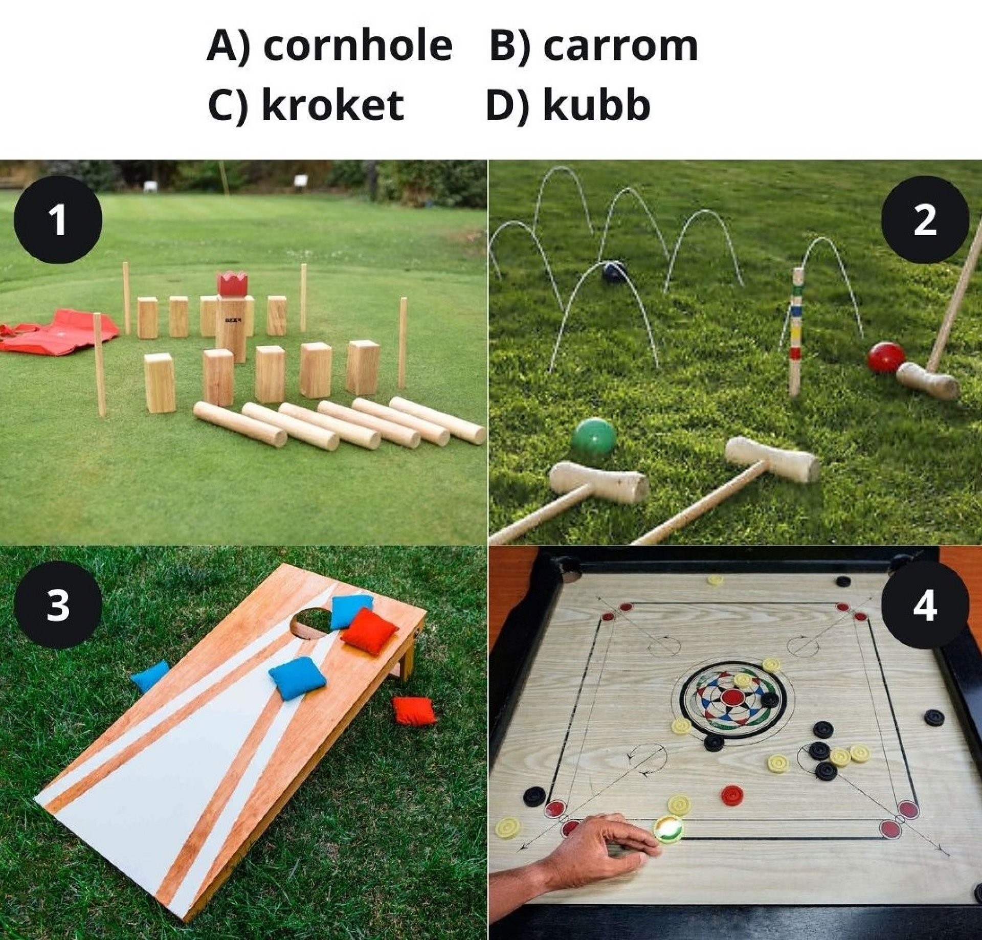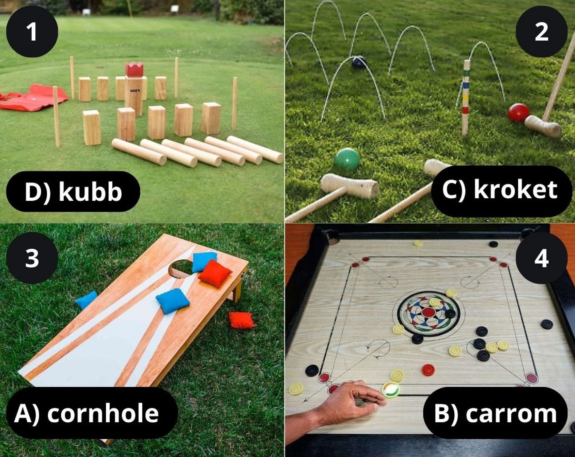 https://cs.wikipedia.org/wiki/Kubb https://cs.wikipedia.org/wiki/Carrom https://en.wikipedia.org/wiki/Croquet https://en.wikipedia.org/wiki/Cornhole