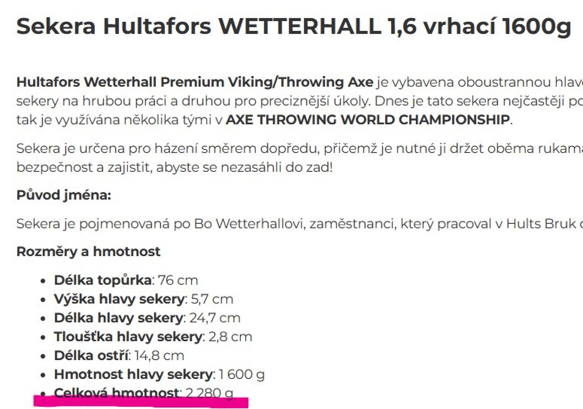 Mít dobrou mušku může být někdy i otázkou života a smrti. Zvlášť když stojíte „modelem“ vrhači seker. Nechat se zasáhnout touto obouruční kráskou totiž určitě nechcete. Kolik tato sekera s názvem Hultafors Premium Wetterhall pro soutěžní vrhání celkem váží? Odpověď uvádějte v gramech.