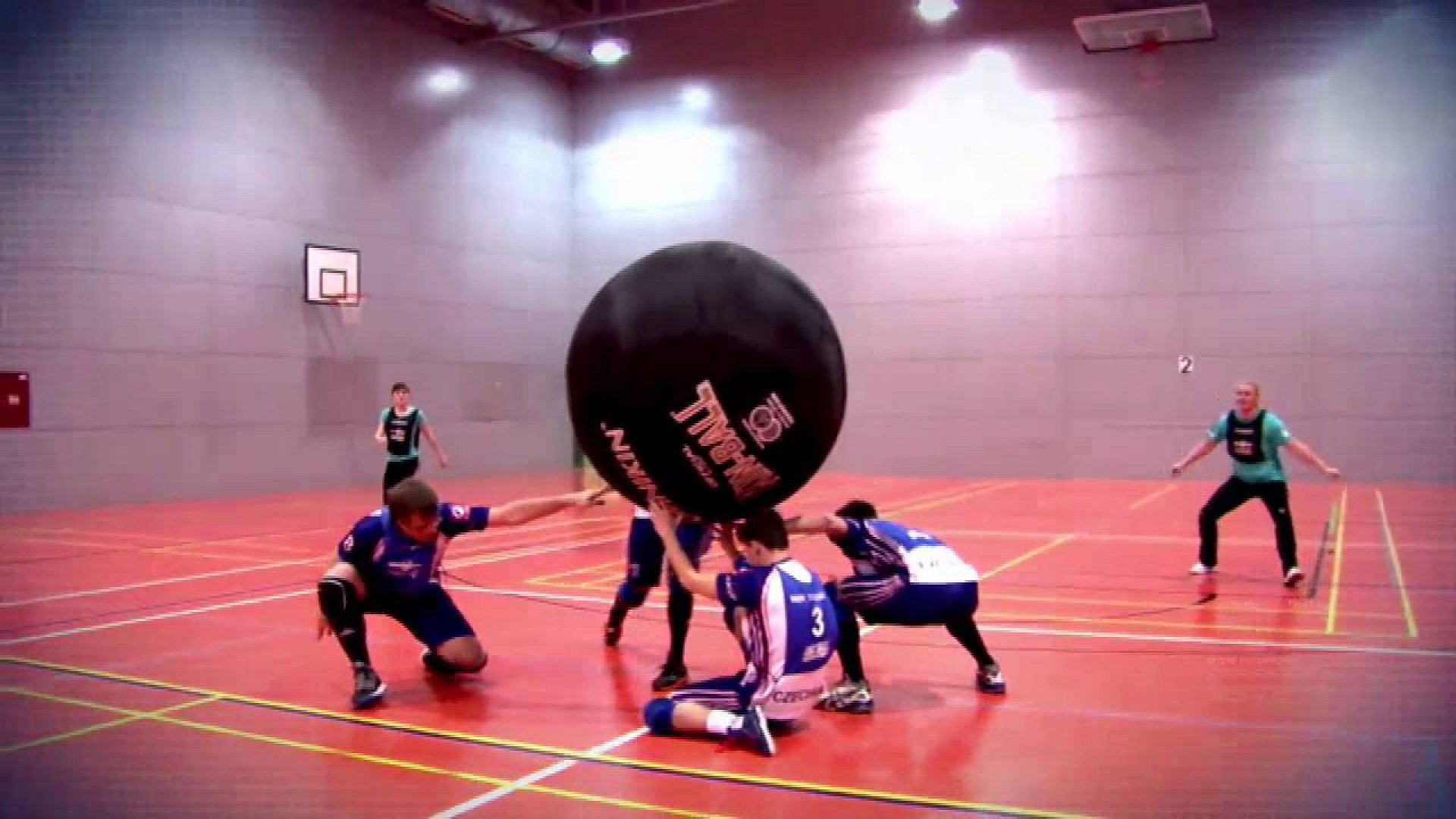 Uveďte jméno týmového sportu, ve kterém proti sobě hrají současně tři týmy o 4 hráčích, používá se míč o průměru 122 cm a bod se získává za dopad míče na podlahu.