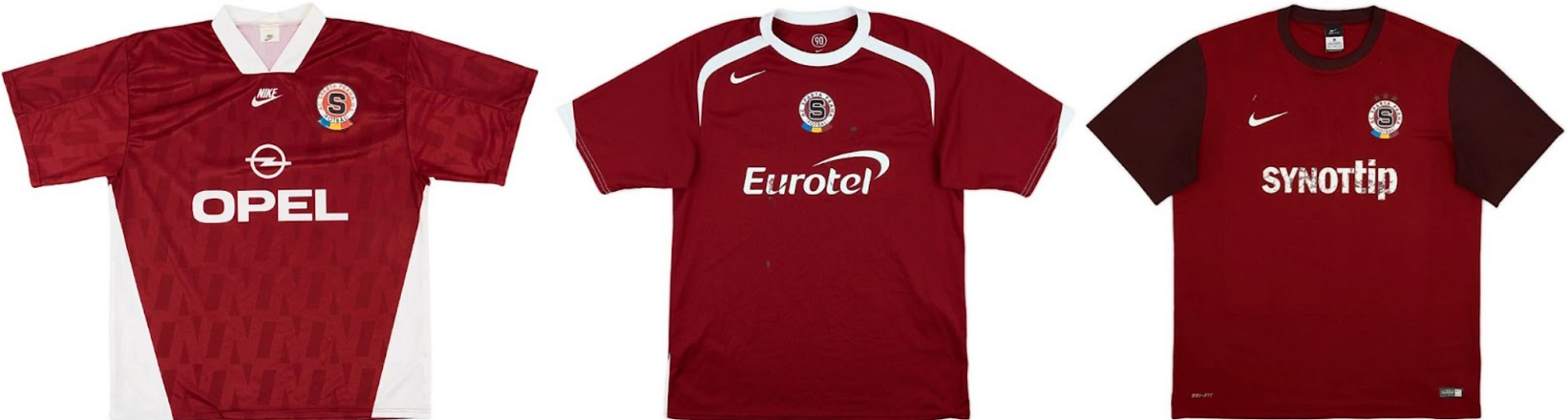 Zde vidíte tři dresy fotbalové Sparty z let 1995, 2005 a 2015. Na všech jsme ale smazali loga hlavních sponzorů a vy je musíte doplnit. Vaším úkolem je tedy napsat název automobilky, mobilního operátora a sázkové kanceláře. Za dva správné údaje si zasloužíte půl bodu.